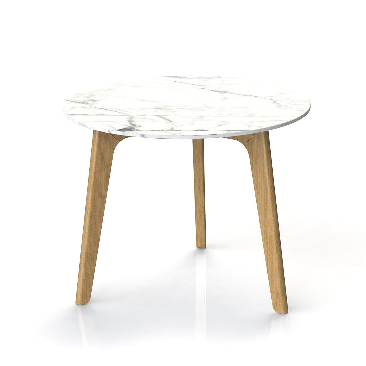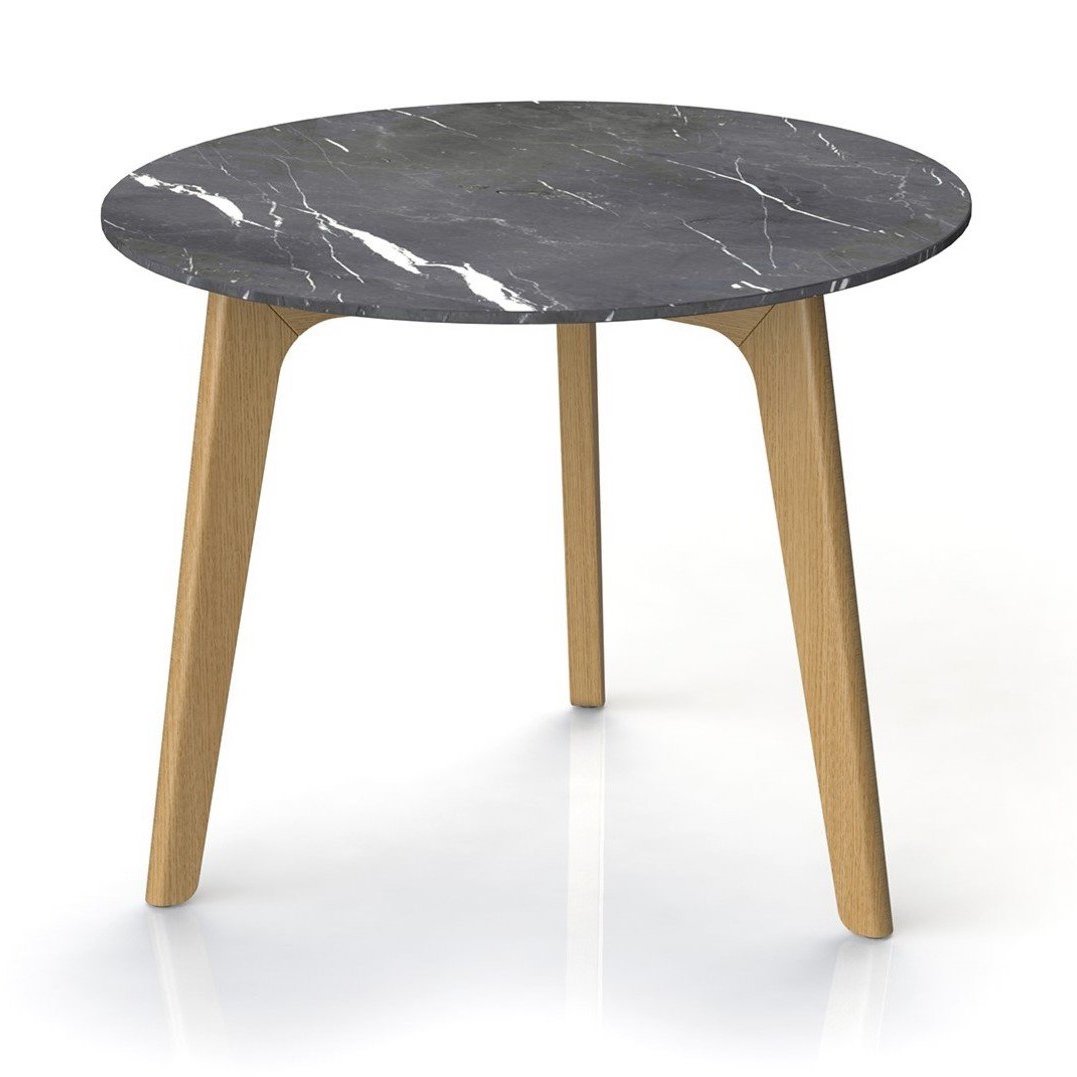Der Tisch ist mit einem Kufen- oder Holzgestell und einer HPL-Platte in weißer oder schwarzer Marmoroptik erhältlich.