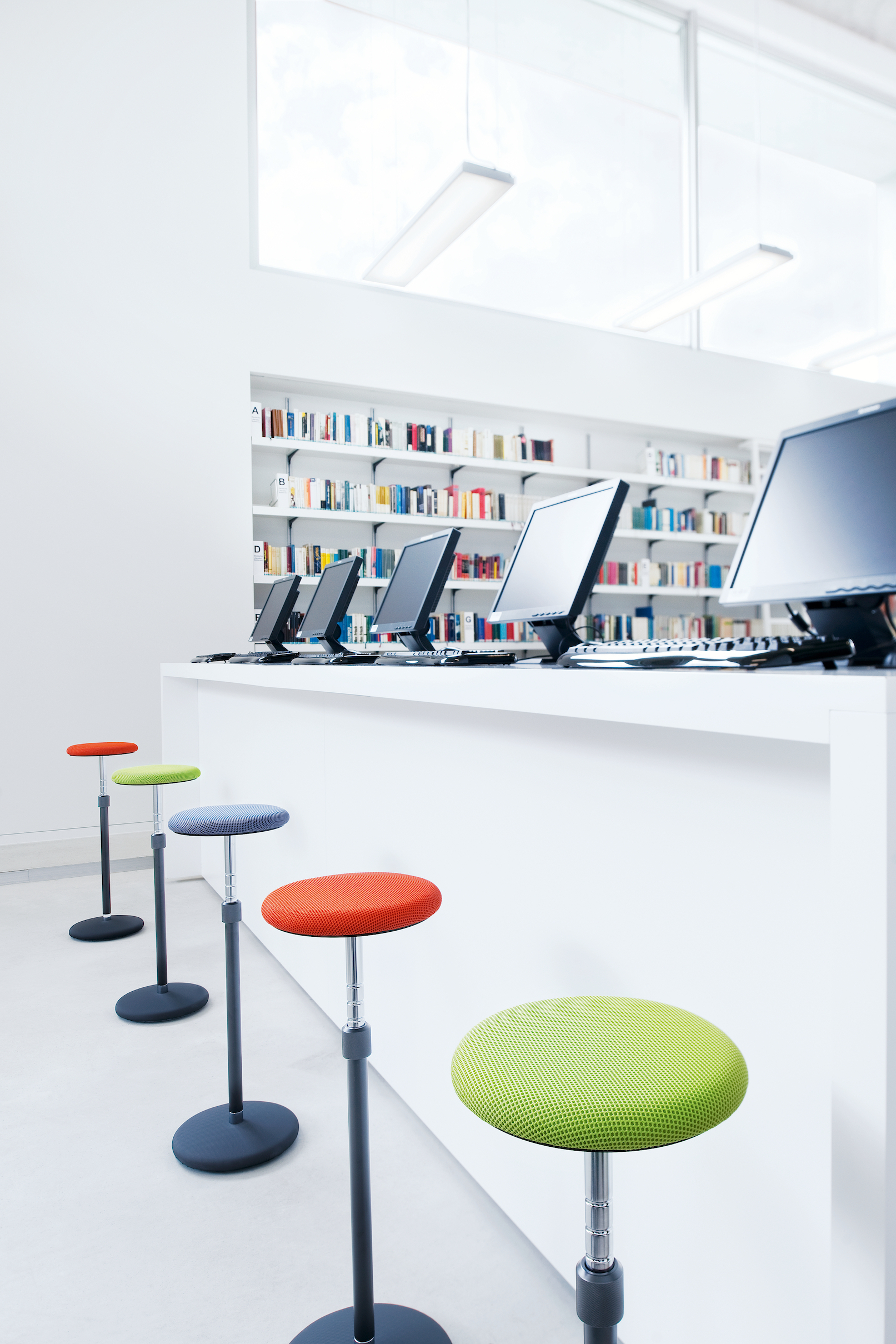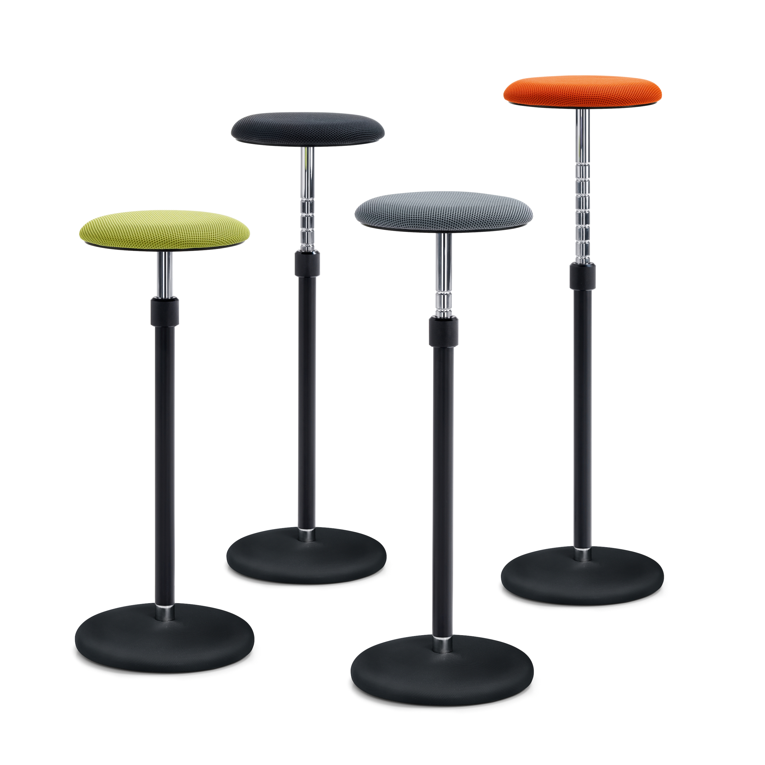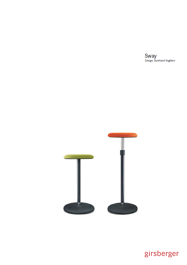 Die bewegliche Lagerung des Standbeins ist das Besondere an Sway. Dadurch stellt sich gesundes, bewegtes Sitzen automatisch ein.  Als Stehsitz entlastet Sway den Körper bei Tätigkeiten im Stehen, die Höhe der Sitzfläche lässt sich mit einem einfachen Handgriff verstellen. Der Sitz ist bequem gepolstert und mit einem robusten und pflegeleichten Textilnetz in Orange, Grün, Grau oder Schwarz bezogen.